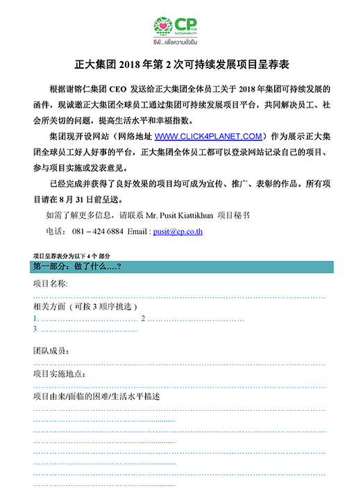 日前,正大集團(tuán)謝镕仁CEO面向正大集團(tuán)全體員工發(fā)布“關(guān)于2018年集團(tuán)可持續(xù)發(fā)展”的函件,呼吁全體員工行動(dòng)起來,共同參與 “點(diǎn)擊改變世界”的活動(dòng)。